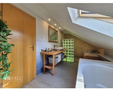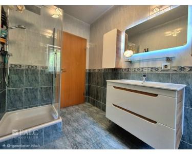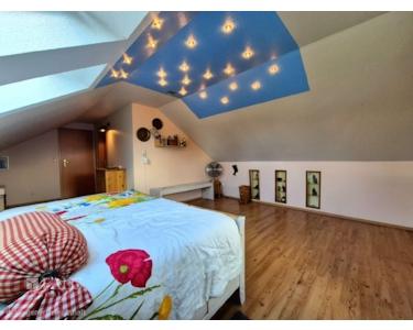 Im Obergeschoss befindet sich ein Schlafzimmer, das durch die Größe und Helligkeit überzeugt. Das Hauptbadezimmer ist mit einer modernen Dusche und einer Badewanne ausgestattet und bietet durch seine Dachfenster viel natürliches Licht. Ein zusätzliches Gäste-WC mit Dusche im Erdgeschoss sorgt für Komfort und Flexibilität.