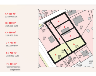 Der Bebauungsplan wird auf Anfrage zur Verfügung gestellt. Wir machen darauf aufmerksam, dass die Einmessung noch nicht erfolgt ist, um den Erwerbern bestmöglichen Handlungsspielraum zu ermöglichen. Auf der Fläche B in der Übersicht befindet sich aktuell noch eine Bestandsimmobilie. Die Wohnfläche beträgt ca. 217 m², Baujahr 1969, und gliedert sich in zwei Wohneinheiten auf. Im Untergeschoss des Hauses befindet sich eine Doppelgarage.
