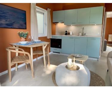 Die Küche ist modern gestaltet und u.a. mit einem Induktionskochfeld mit Dunstabzugshaube, einer Kombi-Mikrowelle, einem Geschirrspüler und einem Kühlschrank mit Gefrierfach ausgestattet.