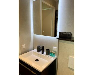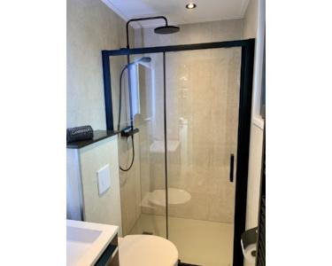 De moderne badkamer met chique uitstraling heeft een douchecabine met glazen schuifwand. Verder is er wasmeubel met verlichte spiegel en een toilet.