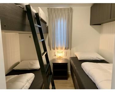 Auf der anderen Seite befindet sich ein Etagenbett, von dem das untere Bett an die Wand geklappt werden kann. Dies schafft z.B. Platz für ein Babybett oder große Koffer (bei einer Belegung mit 4 Personen).
