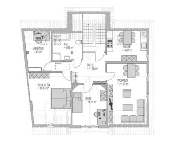 - Dachgeschosswohnung: ca. 92 m², 3,5 Zimmer, Küche, Bad