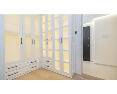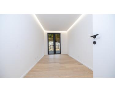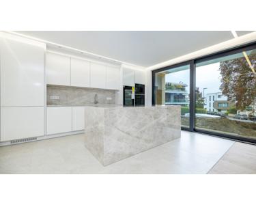 Das luxuriös ausgestattete Badezimmer mit hinterleuchteten Onyxplatten, Ambientebeleuchtung und eleganten Armaturen schafft eine exklusive Wohlfühlatmosphäre. Ein separates Gäste-WC/-Bad, sowie ein praktischer Abstellraum erhöhen den Wohnkomfort zusätzlich. Die Ausstattung erfüllt höchste technische und gestalterische Ansprüche. Eine maßgefertigte Küche mit Markengeräten, Quarzit-Arbeitsfläche und integriertem Spritzschutz fügt sich harmonisch in das elegante Gesamtbild ein.
