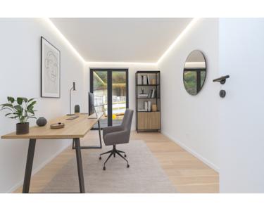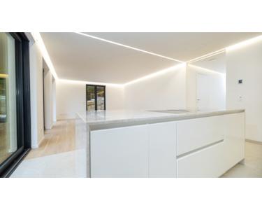 Heiz- und Kühldecken sorgen zu jeder Jahreszeit für ein angenehmes Raumklima. Ergänzt wird dies durch elektrische Beschattung, individuell regulierbare Wohnraumbelüftung und ein intelligentes BUS-System zur zentralen Steuerung von Licht, Temperatur und Technik – für modernen Wohnkomfort auf höchstem Niveau.