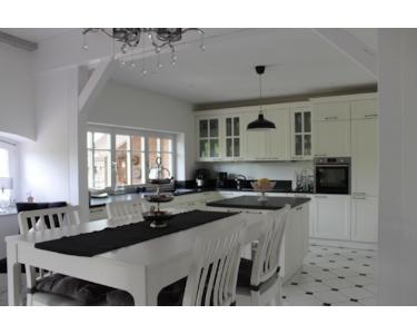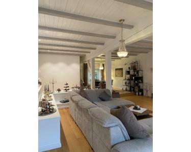 Die Hauptwohneinheit ist durch großzügige und lichtdurchflutete Wohnbereiche gekennzeichnet, die historische Elemente wie Holzbalken und Kaminofen mit Sitzbank mit modernen Akzenten stilvoll kombinieren. Die hell gestaltete Einbauküche mit freistehendem Küchenblock im Landhausstil hat einen direkten Zugang zu einem großzügigen Hauswirtschaftsraum, der keine Wünsche offen lässt.