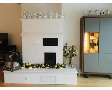 Das Wohnzimmer hat einen großen Kaminofen mit Sitzbank. Ein weiterer Kaminanschluss ist im Obergeschoß vorhanden.