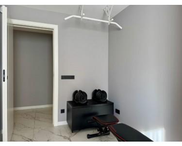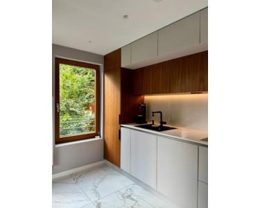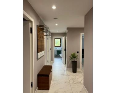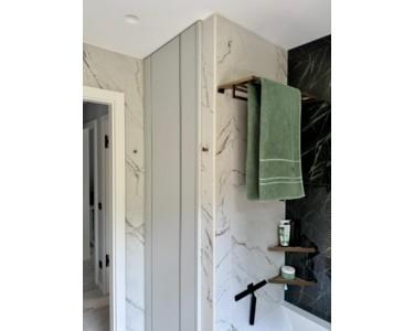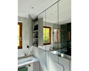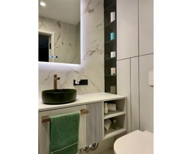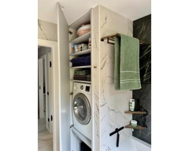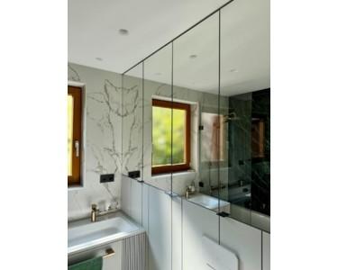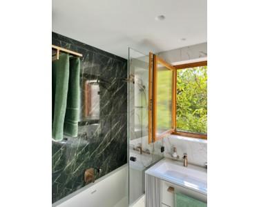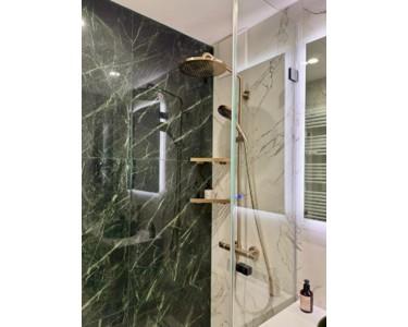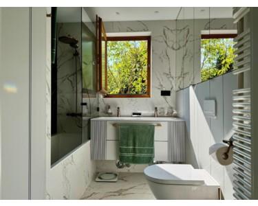 Das von einem Architekten- und Designerteam neu entwickelte Bad-Konzept vereint Luxus und Funktionalität auf höchstem Niveau. Das Masterbad bietet eine Badewanne von Villeroy & Boch, ein Doppelwaschbecken von Kaldewei und einen elegant in einem Einbauschrank integrierten Waschmaschinenanschluss. Das Gästebad überzeugt mit einer maßgefertigten Duschkabine. Hansgrohe-Armaturen in Brushed Bronze und italienische Fliesen im grünen Marmor-Design verleihen beiden Räumen eine exklusive Atmosphäre.