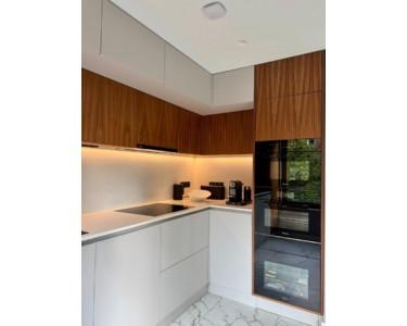 Die maßgefertigte Einbauküche mit Echtholzfronten, Quarzkomposit-Arbeitsplatte und sieben Miele-Geräten (inkl. Dampfgarer, Weinkühlschrank, Wärmeschublade) kombiniert Eleganz, Funktion und Design. Der Küchenwert beträgt 60.000 € und ist nicht im Kaufpreis enthalten.
