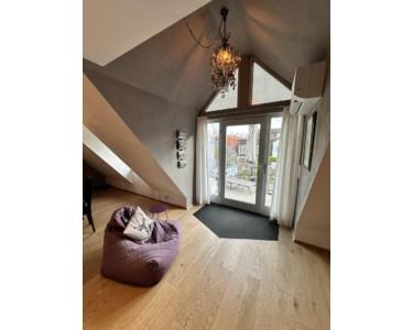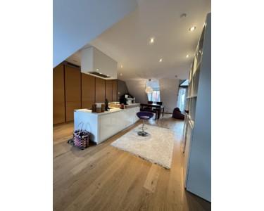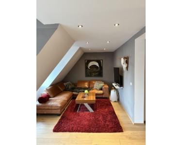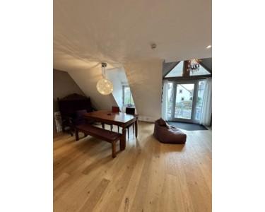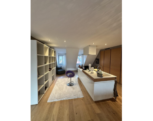 Wenn Sie durch die Eingangsgaube den offenen Wohnbereich betreten, befindet sich links das Wohnzimmer und rechts das Esszimmer mit Küche. Die hochwertige Lackküche der Marke Leicht ist mit Miele Geräten bestückt.