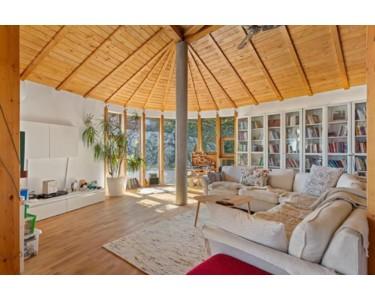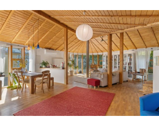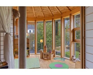 Modernes Niedrigenergiehaus aus nachwachsenden Rohstoffen, innen Holz, außen Holz und Holz als primärer Brennstoff.