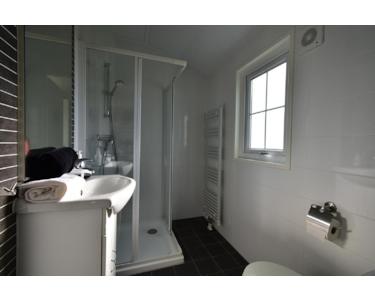 Das moderne Badezimmer bietet optimalen Komfort mit Waschbecken, großem Spiegel mit Beleuchtung, Dusche und Toilette. Die stilvolle Kombination aus weißen Fliesen und schwarzen Akzenten schafft zeitgemäße Ausstrahlung. Die praktische Aufteilung mit Heizkörper sorgt für zusätzlichen Komfort. Die begehbare Dusche mit Glaswand und moderner Duscharmatur bietet luxuriöses Duscherlebnis. Das Fenster sorgt für natürliches Licht und Belüftung. Dieses komplette Badezimmer erfüllt alle Bedürfnisse und erhöht den Komfort des Ferienhauses erheblich.