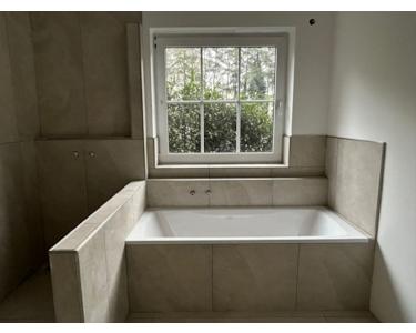 Das Schlafzimmer lädt zum Entspannen ein, während das große Badezimmer mit modernen Armaturen und viel Platz für Komfort sorgt.
