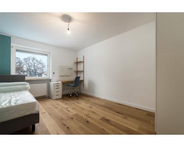 Die beiden Kinderzimmer sind ebenfalls mit Massivholzparkett aus Eiche und der auffallend schönen Sockelleiste ausgestattet. Auch hier moderne Schalter und Steckdosenblenden und elektrisch bedienbare Rollläden. In beiden Zimmern wurden während der Renovierung moderne Designheizkörper eingebaut. Beide Kinderzimmer sind nach Westen ausgerichtet und blicken auch auf den ruhigen und schön angelegten Park.