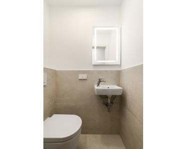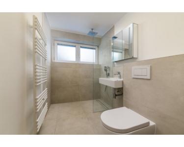 Das modern und zudem zeitlos renovierte Bad, verfügt über Luxuseinrichtungen, wie z.B. eine über die Zimmerdecke verlaufende Regendusche und einer zusätzlichen hochwertigen Handbrause. Die geflieste Dusche ist mit einem unauffälligen Ablauf ausgestattet und ermöglicht auch einen barrierefreien Zugang. Die Bad-Keramiken, wie der Waschtisch und die Toilette und die dazugehörige Drückerplatte wurden gezielt ausgewählt und mit dem Design des Badezimmers abgestimmt. Ein großer Handtuchheizkörper und ein wertvoller Badezimmerschrank mit LED Beleuchtung runden das gelungene Konzept ab. Ein zusätzliches Gäste-WC wurde mit den gleichen hochwertigen Bad-Keramiken in einen luxuriösen, zeitlosen Zustand versetzt.