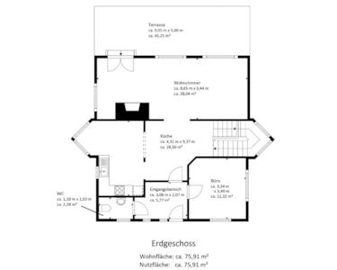 Terrasse, Garten, Keller, Vollbad, Duschbad, Einbauküche, Gäste-WC, Kamin, Teppichboden, Fliesen