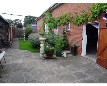 Die große Scheune und der hintere Gartenbereich mit Pool und Gartenhaus wird derzeit