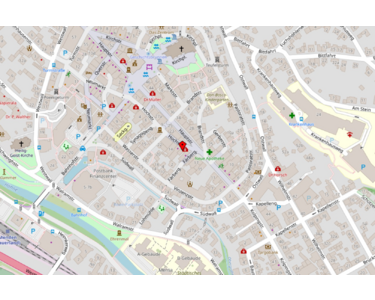 Apotheke, Lebensmittel-Discount, Allgemeinmediziner, Kindergarten, Grundschule, Hauptschule, Realschule, Gymnasium, Gesamtschule, Öffentliche Verkehrsmittel