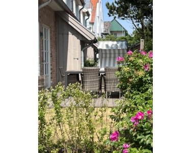 Im Außenbereich gibt es außerdem eine schöne Holz-Terrasse mit Strandkorb, Sonnenliege, Sonnenschirm und bequemen Gartenmöbeln.