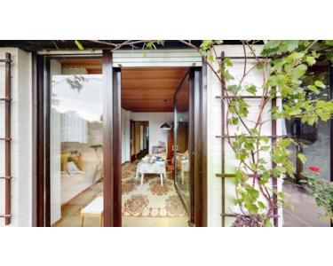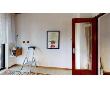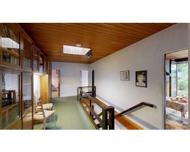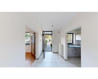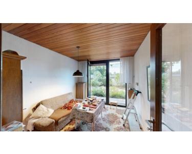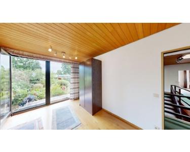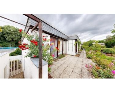 Einfamilienhaus 175m² Eingang im EG, Hauptwohnfläche auf Gartenebene im OG. Die erdgeschossige Einliegerwohnung ca. 57m² verfügt über einen eigenem Eingang. Fassade weiß geschlämmtes Sichtmauerwerk. Attika Naturschieferbekleidung. Geschossdecke Stahlbeton, Flachdach gedämmte Holzbalkenlage mit bituminöser Abdichtung . Dach vor einigen Jahren umfassend saniert. Zusätzliche 36m² geschützte Terrasse auf dem Garagendach.