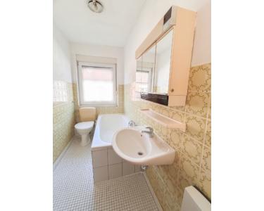 - halbhoch gefliestes Bad mit Stand-WC, Badewanne und Waschtisch im OG