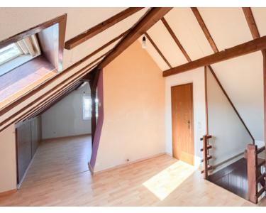 Über das Treppenhaus gelangen Sie in die Ober- und Dachgeschosswohnung mit Diele, Küche, Bad mit Badewanne, Toilette und Waschtisch, Schlaf- und Wohnzimmer. Vom Flurbereich aus führt eine Holztreppe in das Dachgeschoss, mit weiterer großzügiger Fläche zur individuellen Nutzung, einer separaten Toilette und einem Einbauschrank, sowie weitere Abstellfläche in den Schrägen.