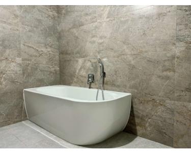 Durch die beiden Badezimmer, ausgestattet mit Wandfliesen in Marmor-Optik und hochwertigen Armaturen, genießen Sie die Annehmlichkeiten einer ebenerdigen Dusche und einer großzügigen Badewanne.