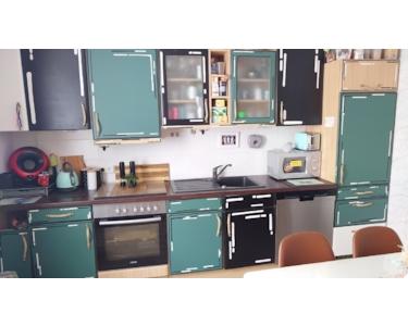 Die angrenzende Küche ist funktional ausgestattet und bietet genügend Stauraum sowie moderne Geräte.