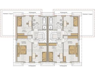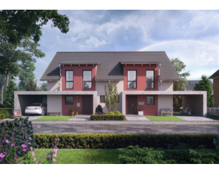 Dieses moderne Doppelhaus fällt durch die Gestaltung der Carports auch als optisch dominante Eingangsüberdachung sofort ins Auge. Bauen Sie das Doppelhaus zusammen mit symphatischen Baupartnern oder bauen Sie es allein und vermieten die zweite Doppelhaushälfte.