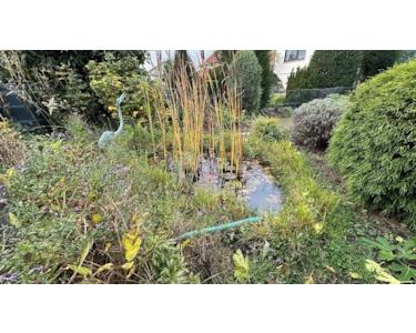 Ebenes Gartengrundstück mit Rasenflächen und edlen Ziersträuchern angelegt, Zufahrt über ein großes Tor möglich (barrierearmer Zugang zum Wohnzimmer möglich), Teichanlage mit Goldfischen, Schilf, Seerosen und Brunnenanlage mit Wasserlauf, dekorative Beete welche mit Palisaden eingefasst wurden.