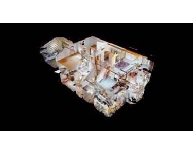 Voluminöser, wintergartenähnlicher Wohn-Essbereich auch zum Dach in offener Bauweise mit direktem Zugang zur Loggia, Abstellraum über Loggia erreichbar, Küche, Dielenbereich mit Zugang zu allen Räumen: Tageslichtbad mit Dusche und zwei weiteren Zimmern