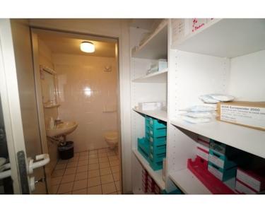Sanitär: Bisheriges Patienten- und Mitarbeiter-WC. Jeweils einfache Ausstattung mit Handwaschbecken