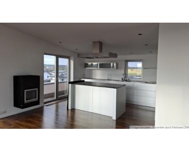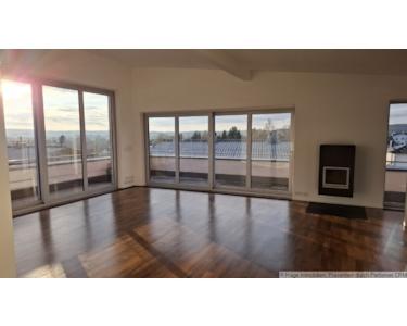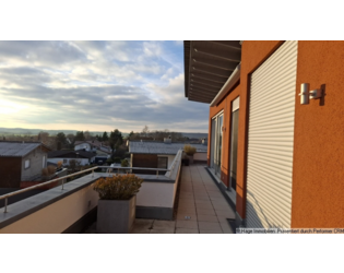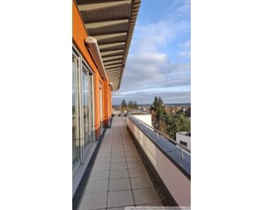 Die Dachterrasse ist großzügig. Sie läuft Entlang der Südseite von Osten her und geht auf die Westseite über. Die Terrassenfläche beträgt ca. 60m². In der Wohnfläche ist diese nur anteilig enthalten.