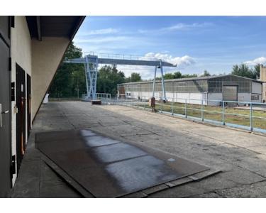 Neben der Verladerampe befindet sich ein ca. 8,0 m hoher Portalkran mit einer Tragfähigkeit von ca. 5.000 KG welcher auf einer Kran-Bahn (Fundamenten Kiesbett) von ca. 14,0 m breiten und ca. 80,0 m Länge über die Gleisen betrieben werden kann.