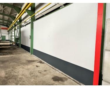Die Höhe am Trauf beträgt ca. 6,00 m und am Fürst ca. 7,00 m. In diesem Teil der Haupthalle befinden sich neben einem 3.000 KG Deckenkran noch 7 Nebenräume (250 m²) welche jeweils durch eine Tür abgetrennt sind.