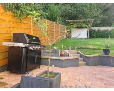 Die Freifläche ist als Rasenfläche mit Ziersträuchern gestaltet, in einer großen Gartenlaube mit schönem Fernblick lassen sich gemütliche Sommerabende und Grillfeste verbringen.