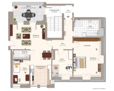 Die Wohnung überzeugt mit einer durchdachten Raumaufteilung und einer hochwertigen Ausstattung. Der offene Wohn- und Küchenbereich sorgt für ein einladendes, modernes Wohngefühl, während das großzügige Schlafzimmer viel Raum für persönliche Gestaltungsideen bietet. Das helle Tageslichtbad ist mit einer Dusche, einer großen Badewanne sowie einem praktischen Waschmaschinenanschluss ausgestattet. Für Gäste steht zusätzlich ein weiteres Badezimmer mit Dusche zur Verfügung. Zwei weitere Schlafzimmer vervollständigen das attraktive Raumangebot. Ein besonderes Highlight ist der weitläufige Balkon, der zum Entspannen und Verweilen im Freien einlädt.