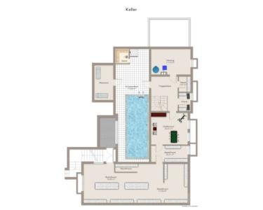 Im voll ausgebauten Untergeschoss erwartet Sie ein privater Wellnessbereich, bestehend aus einem großzügigen Schwimmbecken, einem Whirlpool sowie einer Sauna – ideal für entspannte Stunden zu Hause. Neben den Versorgungsräumen bietet das Kellergeschoss ausreichend Stauraum für eine funktionale Nutzung.