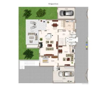 Das Erdgeschoss punktet mit einer separaten Zwei-Zimmer-Einliegerwohnung, ideal für Gäste, Au-pair oder zur Vermietung. Zusätzlich befindet sich hier ein großzügiges Wohn- und Esszimmer mit offenem Kamin, das durch seine offene Gestaltung und Helligkeit beeindruckt. Die angrenzende Küche ist gut dimensioniert und funktional angebunden. Ein echtes Highlight ist der großflächige Wintergarten mit einem weiteren offenen Kamin, der den Wohnbereich elegant erweitert und zu jeder Jahreszeit höchsten Wohnkomfort bietet. Ein Gäste-WC rundet das Erdgeschoss ab.
