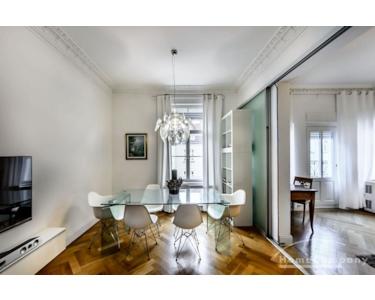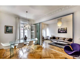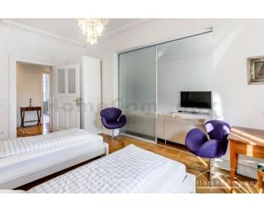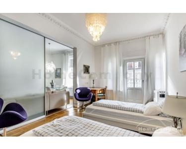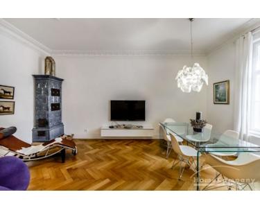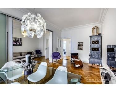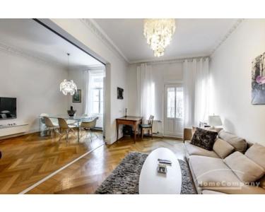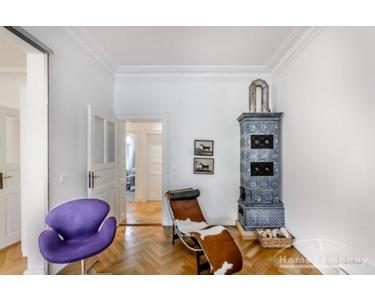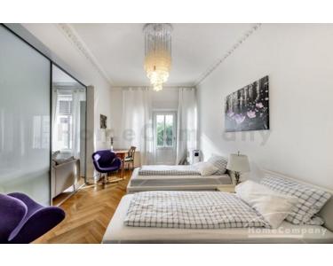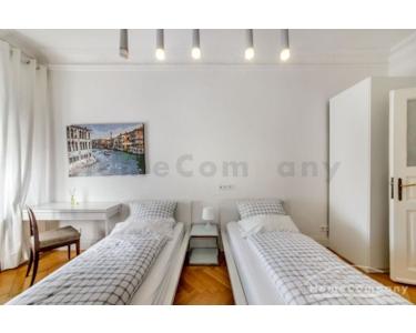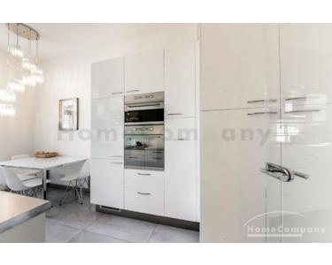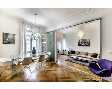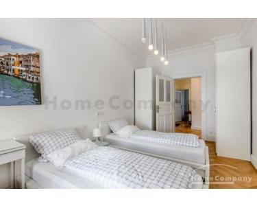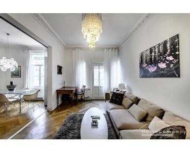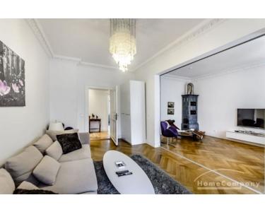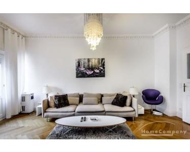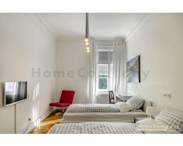 Das Wohnhaus ist ruhig, aber dennoch sehr zentral gelegen, die Wohnung selbst befindet sich im 3. Stock mit Aufzug. Das Wohnzimmer ist mit gemütlicher Couch und Lounge-Chairs sowie einem sehr schönen antiken Schreibtisch mit passendem Stuhl möbliert. Eine große Schiebetür trennt den Wohn- vom Essbereich. Hier befindet sich ein großer schöner Glastisch mit Sitzmöglichkeiten für 6 Personen. Die Wohnung verfügt über zwei Schlafzimmer, jeweils ausgestattet mit Doppelbett und großem Kleiderschrank und Flatscreen-TVs. Eines der Schlafzimmer hat ein En-suite-Bad mit Badewanne. Ein weiteres Badezimmer mit Tageslicht ist vom Flur aus zu betreten. Es ist mit Handtuchheizung und Dusche mit TV ausgestattet. Die Küche ist mit einem weiteren Essplatz für vier Personen und allem ausgestattet, was man für den täglichen Bedarf benötigt, unter anderem natürlich Backofen, Kochfelder und Spülmaschine. Waschmaschine und Trockner befinden sich in einer separaten Kammer. Sonstiges: Sehr hochwertig renoviert, moderne Ausstattung, Parkettböden. Internet inkludiert.