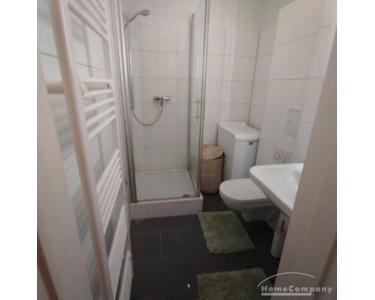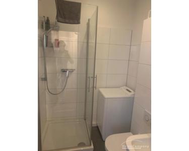 Das hell geflieste Bad verfügt über eine Dusche; hier befindet sich auch die eigene Waschmaschine.