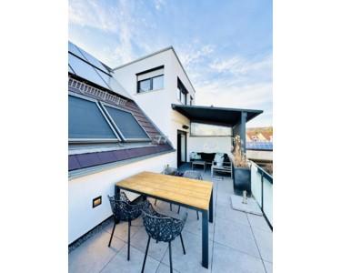 Diese luxuriös ausgestattete Maisonettewohnung erstreckt sich über das 2. und 3. Obergeschoss eines modernen Vierfamilienhauses (Baujahr 2017). Mit ca. 157,4 m² Wohnfläche (nach DIN) und 5,5 Zimmern bietet sie großzügiges Wohnen für Paare und Familien. Die 22,8 m² große Dachterrasse mit Süd-Ost-Ausrichtung und automatischer Beschattung ist ein echtes Highlight.