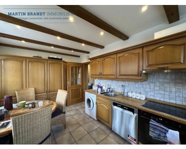 Der Wohnbereich besticht durch eine gemütliche Atmosphäre, die durch den vorhandenen Kamin zusätzlich unterstrichen wird. Die Böden variieren zwischen Fliesen, Teppich und Parkett und bieten somit eine interessante Vielfalt. Die Einbauküche (Eiche Natur) ist funktional und fügt sich harmonisch in den Wohnraum ein.