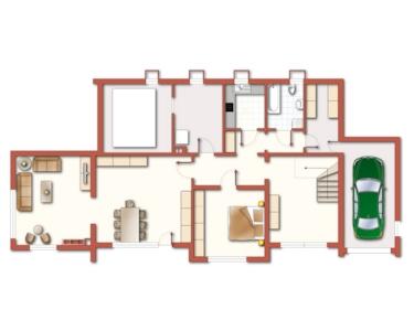 Ebenfalls im Erdgeschoss befinden sich der Heizungsraum, das Öllager, ein Vorratsraum sowie die integrierte Garage.