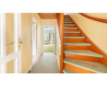 Über eine Holztreppe erreichen Sie das Obergeschoss, wo sich das großzügige Schlafzimmer, das Gäste-/ Kinderzimmer und das hell geflieste Vollbad (innen liegend) befinden.