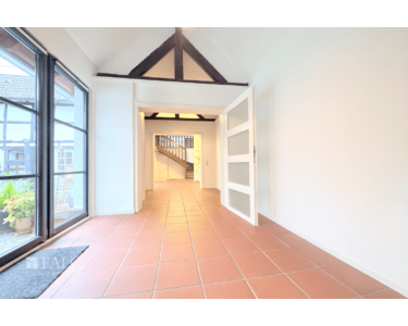 Bereits beim Betreten der Immobilie wird deutlich, dass es sich hier um ein außergewöhnliches Wohnensemble handelt, das ein liebevoll restauriertes Fachwerkhaus aus dem 18. Jahrhundert mit einem stilvollen, modernen Anbau harmonisch vereint. Der zentrale Eingangsbereich fungiert als verbindendes Element beider Gebäudeteile und heißt Bewohner und Gäste in einem einladenden Ambiente willkommen. Hier befindet sich auch ein modernisiertes Gäste-WC.