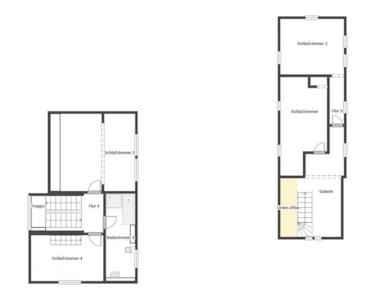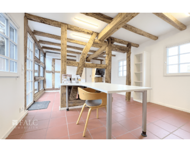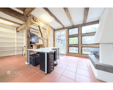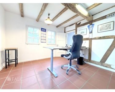 Von diesem Zwischenbereich aus führt der Weg nach rechts in das historische Fachwerkhaus, das im Jahr 2010 umfassend entkernt, gedämmt und technisch modernisiert wurde. Im Erdgeschoss erwarten den Besucher zwei charmante Räume, die sich ideal als Büros, Arbeitszimmer oder kreative Rückzugsorte eignen. Edle Holzböden und atmungsaktive Kalkfarbe schaffen ein gesundes Raumklima und unterstreichen den authentischen Charakter des Gebäudes. Ein offener Kamin sorgt für eine warme, inspirierende Atmosphäre. Ergänzt wird das Erdgeschoss durch ein eigenes Badezimmer sowie einen kleinen Keller, der zusätzlichen Stauraum bietet. Über eine Treppe gelangt man in das Obergeschoss des Fachwerkteils, wo zwei weitere gemütliche Zimmer zur Verfügung stehen und als Schlaf-, Gäste- oder Hobbyräume genutzt werden können.