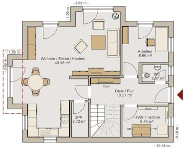 Das Dreigiebelhaus für die junge Familie. Mit raffinierten Grundrissen für das neue Familienleben. Im Erdgeschoss Essen und Wohnen auf rund 41 m² und eine leicht abgesetzte Küche mit Abstellraum.