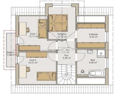 Im Dachgeschoss haben wir den Flur bewusst kleiner geplant und so mehr Platz für das Schlafzimmer mit eigenem Ankleideraum und die 2 großzügigen Kinderzimmer mit Balkon geschaffen.