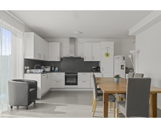 Im Inneren erwartet Sie eine hochwertige Einbauküche (EBK), ein großzügiger Wohn- und Essbereich mit Zugang zum Balkon, sowie drei Schlafzimmer, von denen eines bei Bedarf geöffnet werden kann, um den Wohnbereich zu erweitern. Das Badezimmer ist modern ausgestattet, verfügt über eine ebenerdige Dusche und ist somit komfortabel und barrierefreundlich.