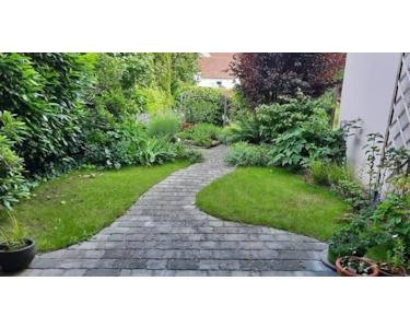 • Gartenanlage mit Weg und Sitzplatz, bepflanzt, gepflegt